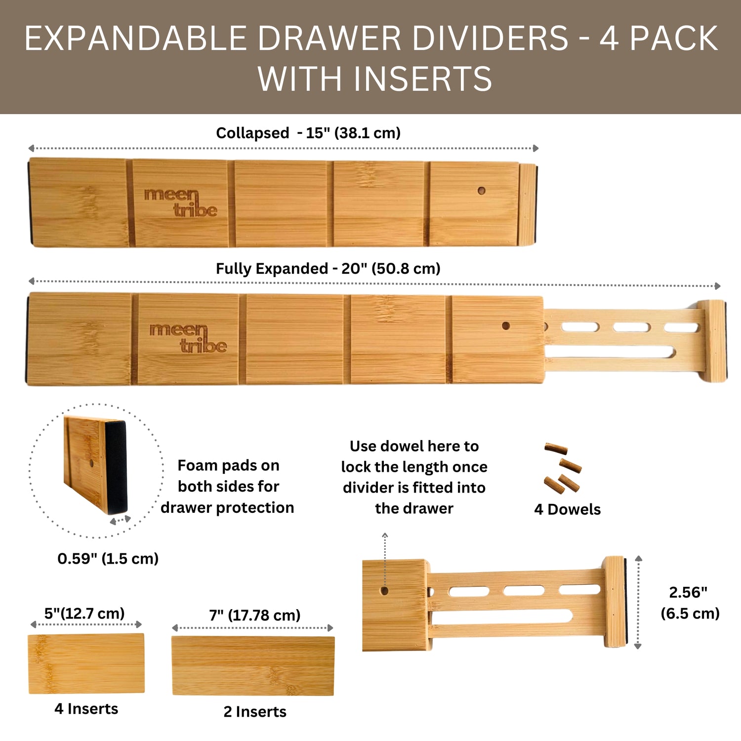 Bamboo Drawer Dividers with Inserts - 4 Pack