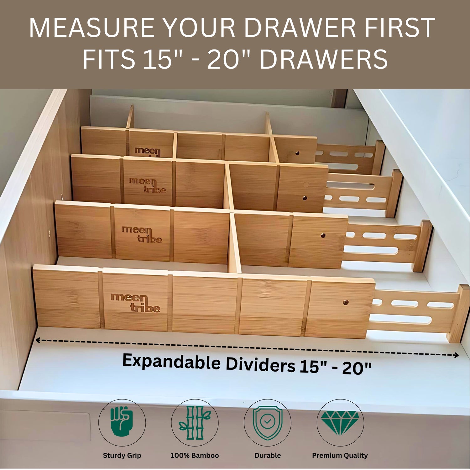 Expandable Drawer Dividers 15" - 20" for organising drawers in kitchen, bedroom, bathroom, office and more. Organise kitchen cutlery, utensils, silverware, crafts, office supplies, cosmetics, jewellery, tools, bathroom essentials etc. with these drawer storage dividers.
