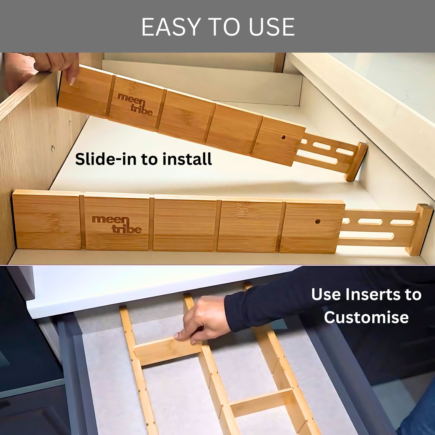 These bamboo dividers are expandable and versatile, providing a good organisation system for your drawers. I found that I was able to use mine to separate and segment 2 drawers.The large dividers are spring loaded so they secure well to the edges of the drawer. The small segment dividers slot within grooves of the large dividers, which also secures them well.A reminder to buyers to measure your drawers before purchasing. I bought mine with the intention to use them in my kitchen drawers, and the dividers were about 1cm too long. I've been able to use them elsewhere.