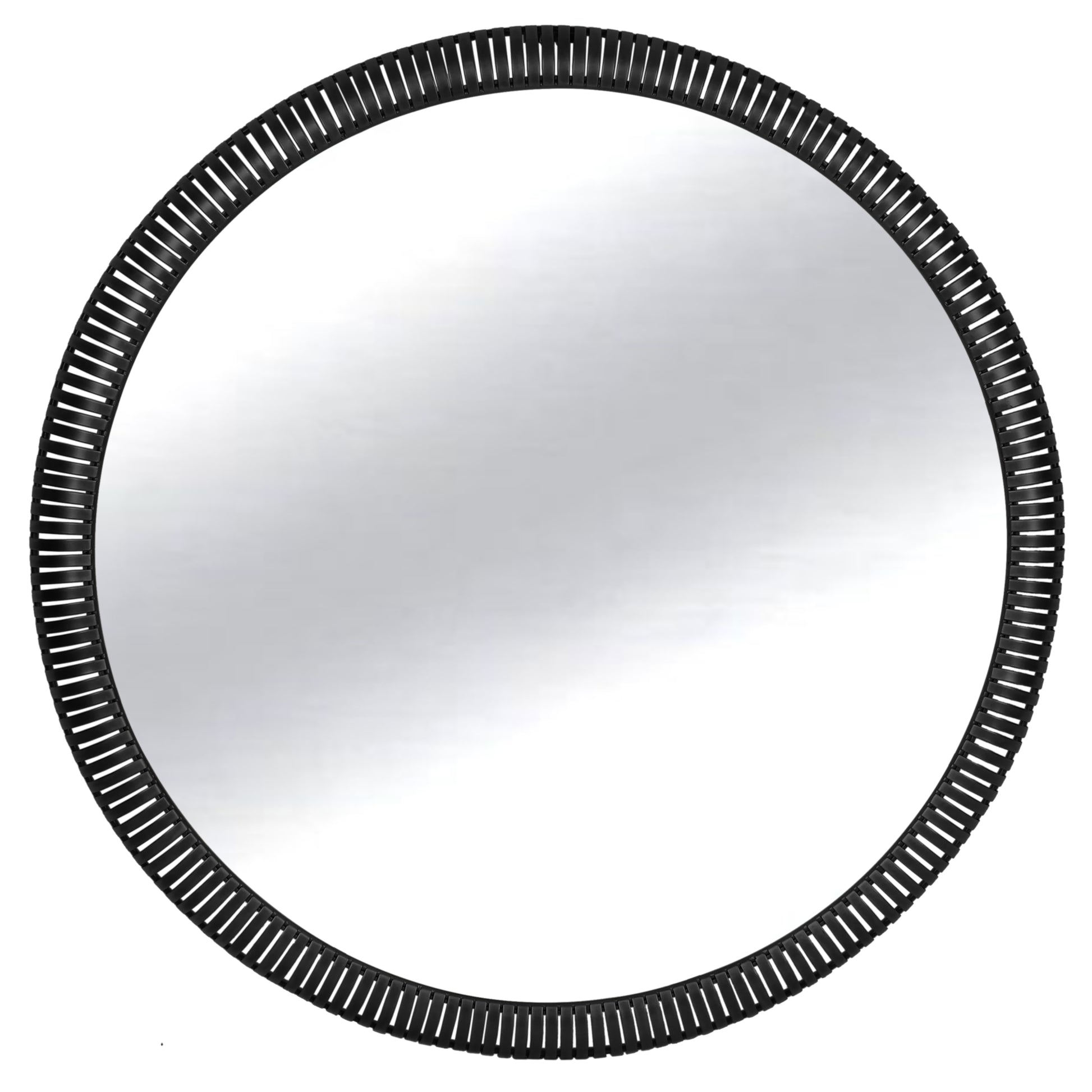 - Modern Architectural Design – The Edge of Glory Mirror features a bold black metal frame with evenly spaced cut-out slits, creating a rhythmic, gear-like visual effect.