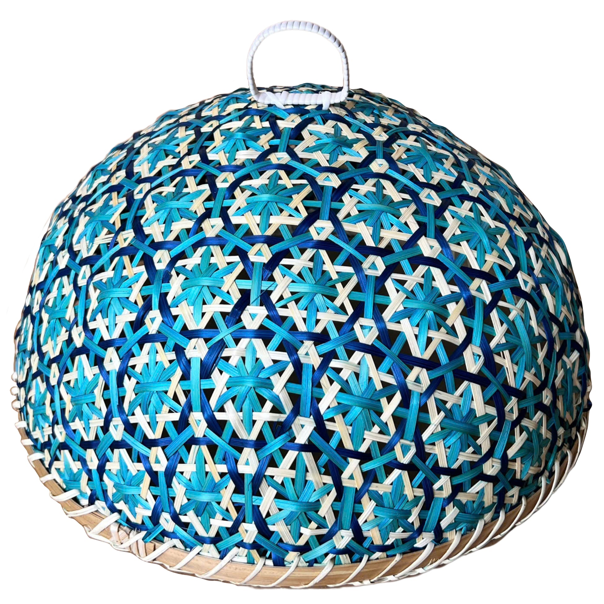 - Artisanal Design: Handcrafted bamboo food cover featuring an intricate star-pattern weave in natural and navy tones.