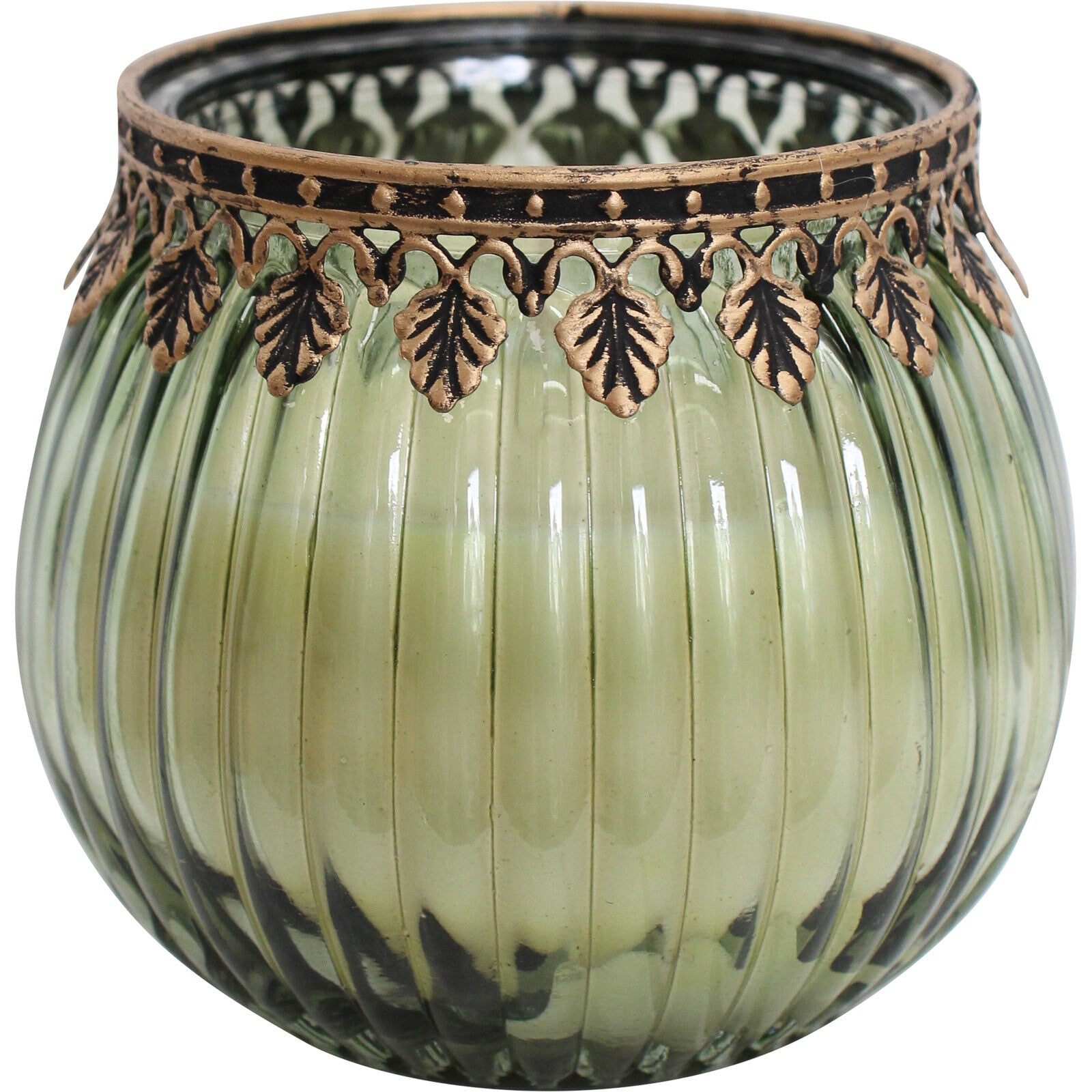 - Elegant vintage design candle featuring smoky green glass, golden accents, and a stylised leaf rim for a touch of sophistication