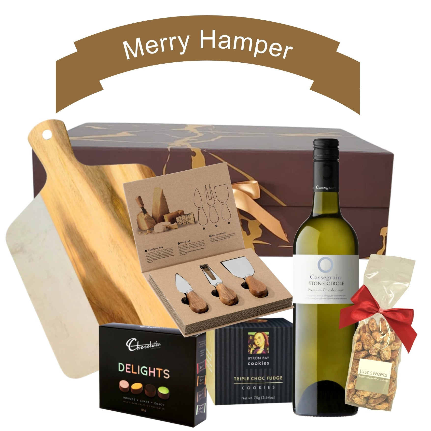 Inside, you’ll find a wood and marble chopping board paired with a set of cheese knives, setting the stage for effortless entertaining. Indulge in Cassergrain wine, Byron Bay cookies, roasted & smoked almonds, and a decadent milk & dark chocolate bar.